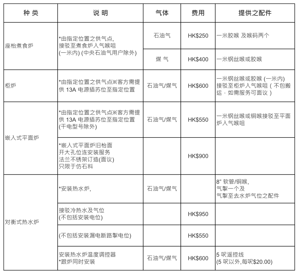 标准安装服务价目表