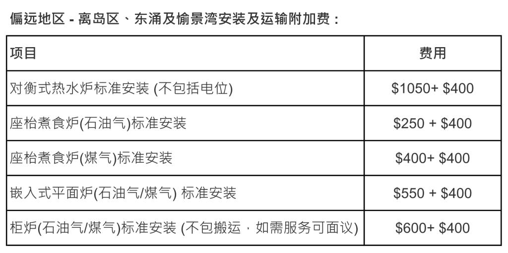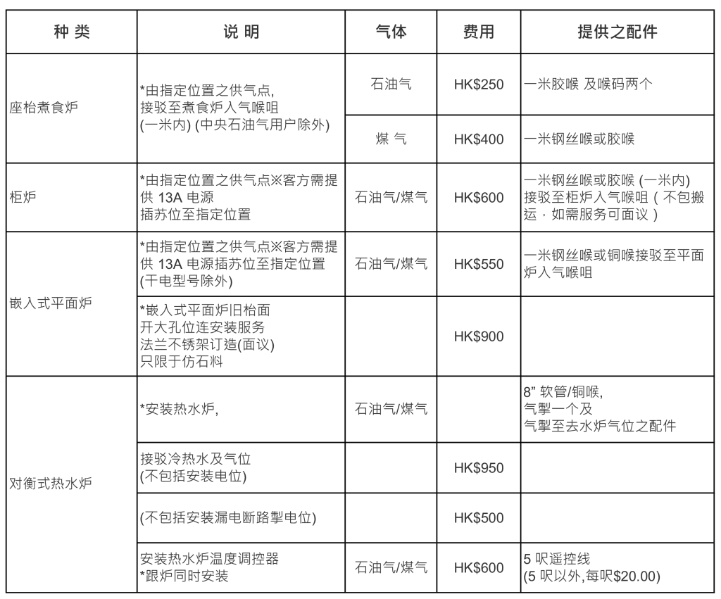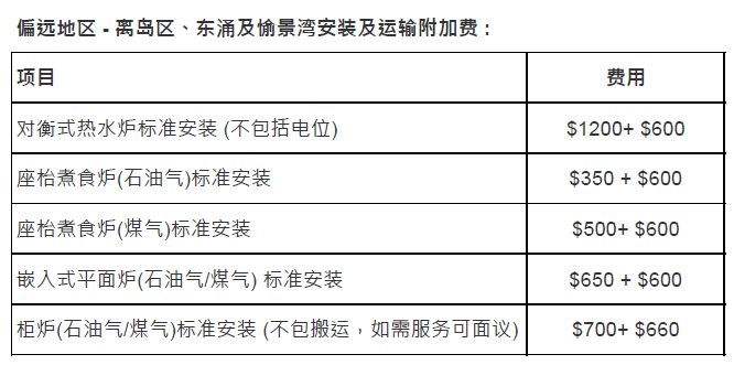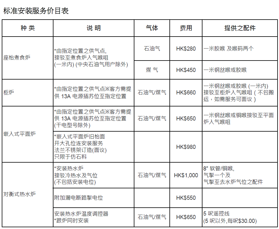标准安装服务价目表