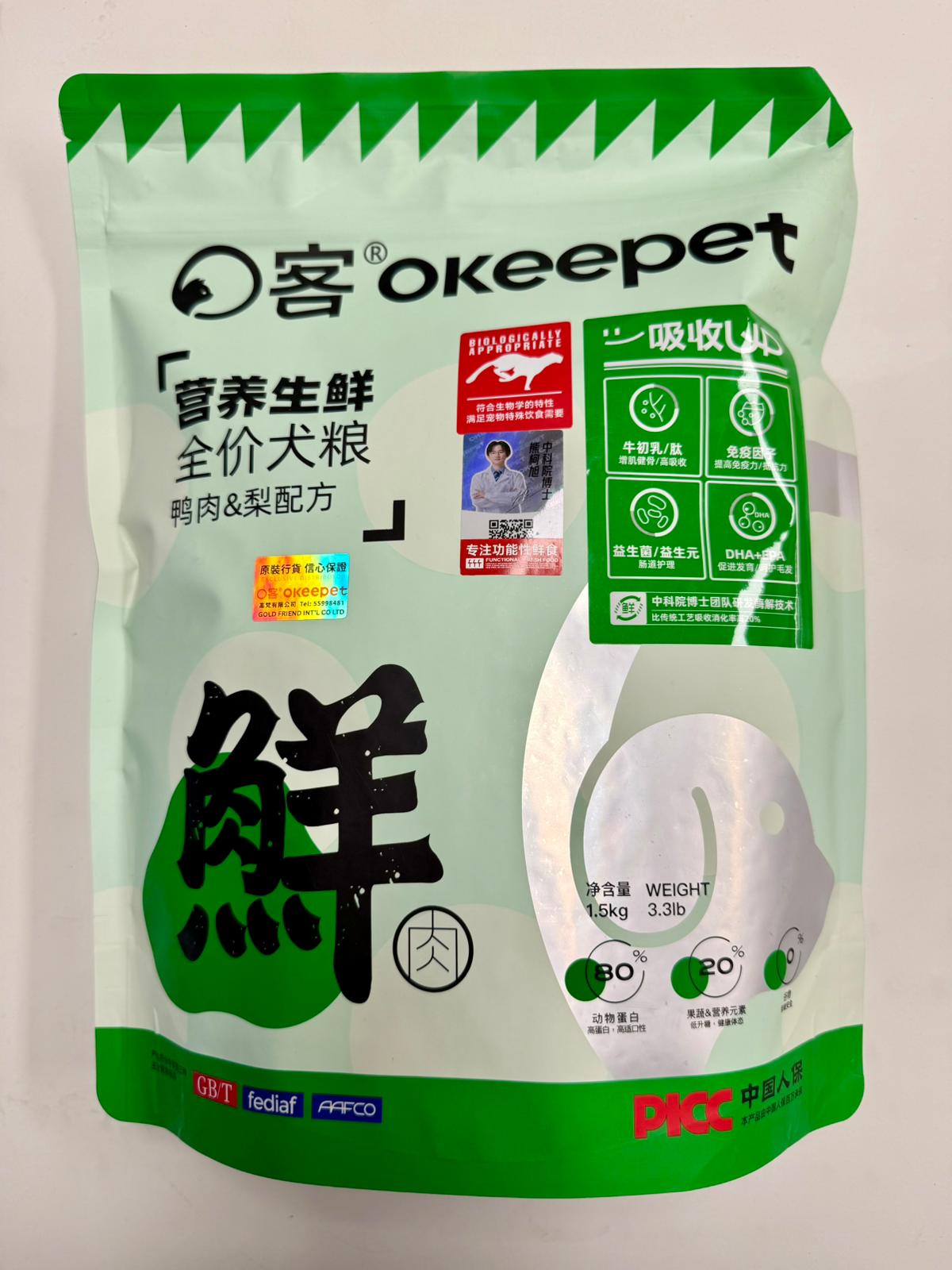 產品名稱 : Okeepet 營養生鮮全營養犬糧(鴨肉+雪梨配方)